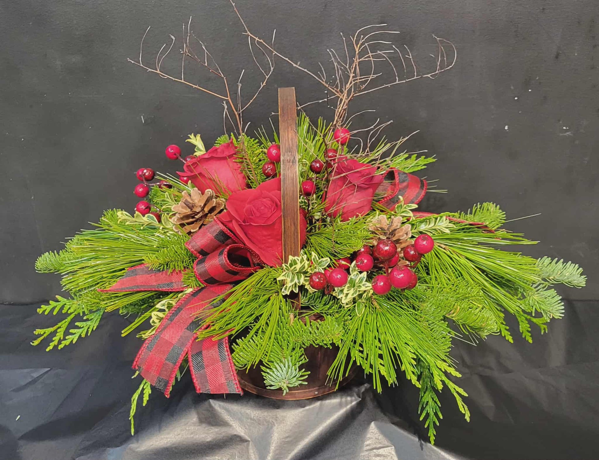 A rustic basket filled with roses, pine cones, berries & festive greenery is sure to please!