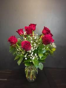 A classic favourite,12 exquisite red roses, arranged beautifully in a glass vase with babies breath & greenery.