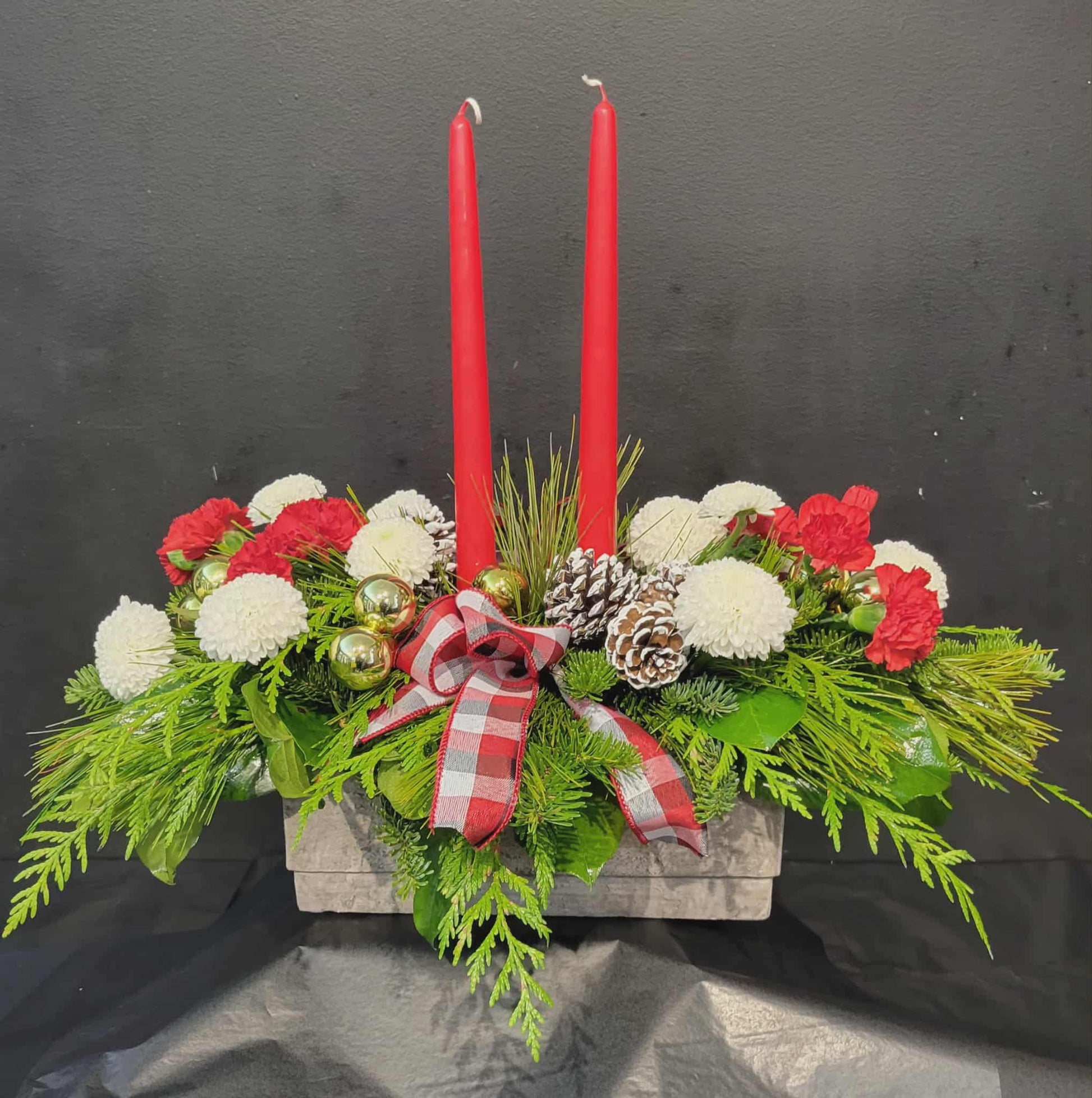 2 taper candles create a warm holiday glow in this traditional red & white arrangement in a rectangular ceramic container