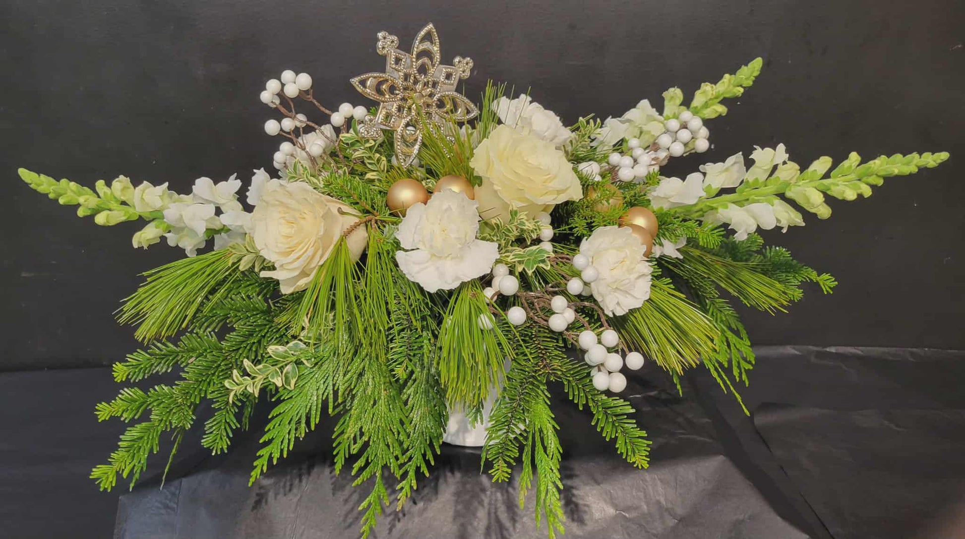 Stunning white roses are combined with Carnations, Snapdragons & berries, festive pine cones, gold glass balls & a golden snowflake ornament, tastefully arranged in a white ceramic dish.